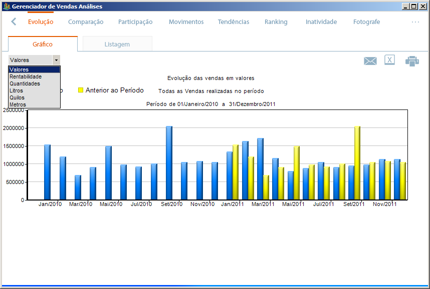 Uma visão exata por valores, rentabilidade, quantidades, litros, quilos e metros.