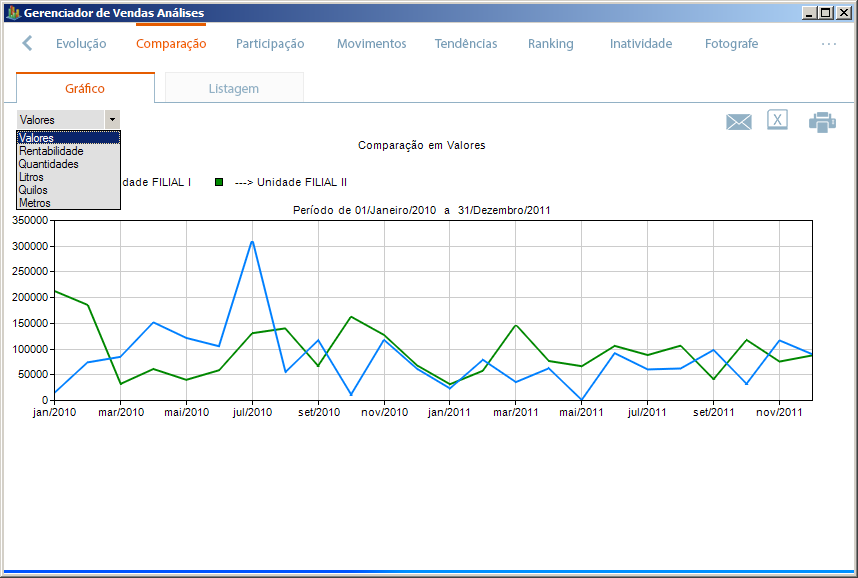 As análises são geradas por unidades de negócios, estados, cidades, regiões, gerentes, representantes, canais, segmentos, marcas, linhas e grupos de produtos, produtos, clientes e suas filiais e coringa. Combinadas da forma que você necessitar.