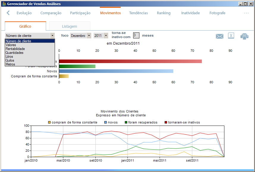 GERENCIADOR DE VENDAS ANÁLISES elabora estatísticas de evolução, comparação, participação, ranking, inatividade, tendências, movimentos e fotografa onde está ganhando ou perdendo mercado.