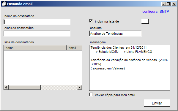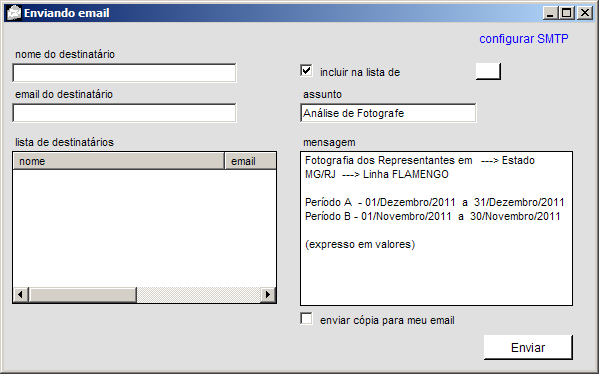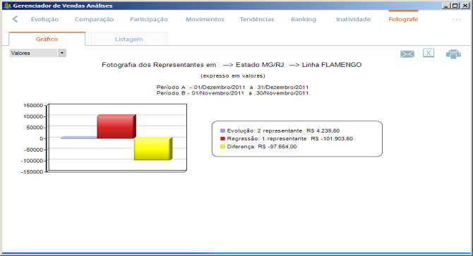 Ao enviar um email segue em anexo os gráficos, as listagens e as planilhas geradas. | | Função: FOTOGRAFE Compara as vendas dos representantes que atuam nos estados de MG e RJ com a Linha de Produtos Flamengos e demonstra quais evoluiram e quais regrediram em suas vendas em um período em relação a outro. |