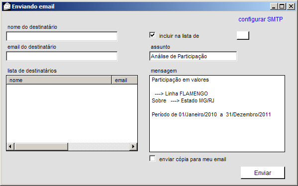 Ao enviar um email segue em anexo os gráficos, as listagens e as planilhas geradas. | | Função: PARTICIPAÇÃO Analisa a participação da Linha de Produtos Flamengo nos estados de MG e RJ. |