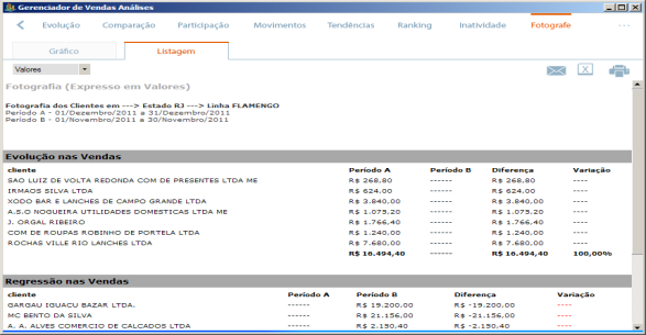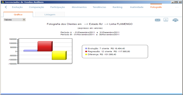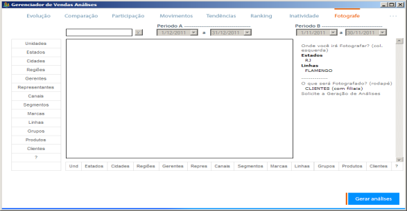 Gerenciador de Vendas Análises (Versão 2014)Business Intelligence com foco em vendasAnálise Fotográfica das Vendas Identifica onde suas vendas evoluíram e onde regrediram em um período em relação a outro. Você pode por exemplo fotografar seus clientes no estado de MG, cidade de Belo Horizonte no primeiro trimestre de um ano em relação ao primeiro trimestre do ano anterior e identificar quais foram os clientes que regrediram e quais os que evoluíram. Na coluna da esquerda, você seleciona onde irá Fotografar: estado de MG, cidade de Belo Horizonte. No rodapé você define o que será Fotografado no estado de MG,cidade de Belo Horizonte: Clientes Lembre-se: Você pode selecionar o que desejar na coluna da esquerda e no rodapé. Isso lhe permite uma infinidade de combinações.