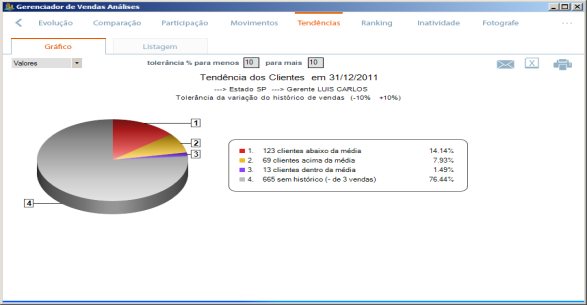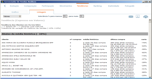 | Em sua forma analítica o Tendências demonstra a frequência de compras dos clientes do Gerente Luis Carlos no estado de SP indicando os que estão abaixo, acima ou dentro de seu padrão histórico. Efetuar uma análise como essa selecionando um representante na coluna da esquerda e seus clientes no rodapé, lhe propicia importantes informações para o gerenciamento e cobrança de resultados de seus representantes. |
